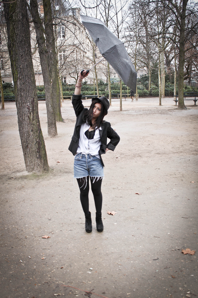 Donc au début j’ai porté mon short en jeans levi’s puis ensuite j’ai porté ma nuisette par dessus mais ça faisait trop sexy alors j’ai pris une simple chemise blanche puis un blazer noir et voilà le résultat , un style à peu près décalé je dirai ! Mais vous savez où j’ai trouvé mon blazer ? dans les rayons enfants chez les garçons et comme je suis petite ça m’allait parfaitement !