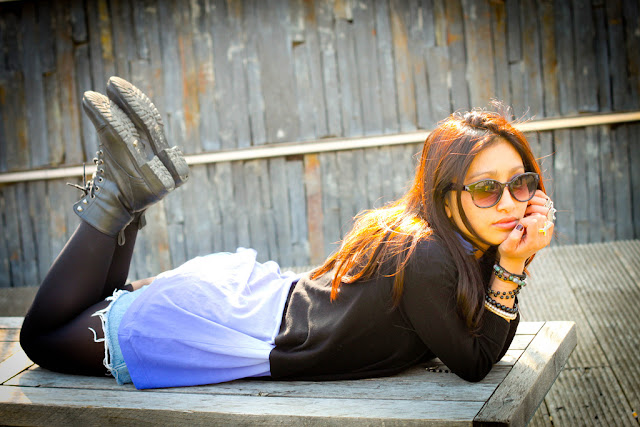 C’était une journée très ensoleillée! Je me suis habillée très confortablement pour aller en cours! Je me suis habillée en violet parce que ça faisait longtemps et que c’est ma couleur préférée. J’ai opté pour un style assez rock! J’ai acheté mon haut à Uniqlo, j’ai craqué pour ce dégradé de couleur, je ne l’ai acheté que 6 euros pendant les soldes et comme je suis petite, ça me fait une sorte de petite robe!