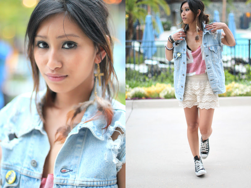 Me voici à downtown Disney et oui je n’ai pas pu rentrer à Disney car cette semaine j’ai trop depensé et je viens tout juste d’acheter mes billets d’avion pour Washington pour ce week end mais j’espère que je pourrais y aller avant de rentrer en France. Sinon je porte une tenue assez décontractée avec ma nouvelle veste en jeans Levi’s que j’adore achetée à Melrose Av mariée avec un short en dentelle très agréable à porter et un simple top de forever 21. Puis côté accessoires j’aime tout particulièrement ma boucle d’oreille en plume et aussi avec une croix que j’ai acquis également à Melrose.