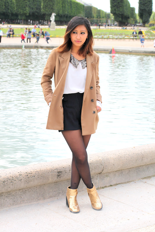 Hey, me voici au Jardin du Luxembourg avec une tenue assez chic dans laquelle je porte une blouse avec un col à sequins que j’ai commandé sur Sheinside avec un blazer de couleur camel. Je porte mes nouvelles bottines de chez Doll Boutique de la marque Senso et je peux vous dire qu’elles me font vraiment mal aux pieds, c’est peut être parce que je n’ai pas l’habitude de porter des chaussures à talons. Je ne pense pas que je vais souvent les porter mais bon je les aime quand même.