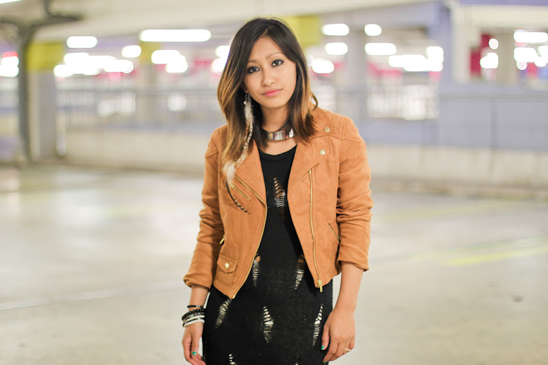 In this post, I will talk about my new biker jacket from H&M that I was looking for a long time ago. I just saw this jacket on Vanessa Hudgensand I wanted to have the same jacket as her but it was sold out, then I found this jacket for 40 euros and I bought the same in blue. I wear it with my destroy dress that I found in my closet with my feather earring from Random and Beautiful. Otherwise, when I went to California, people said that I look like a mexicain girl because of the feather on me.