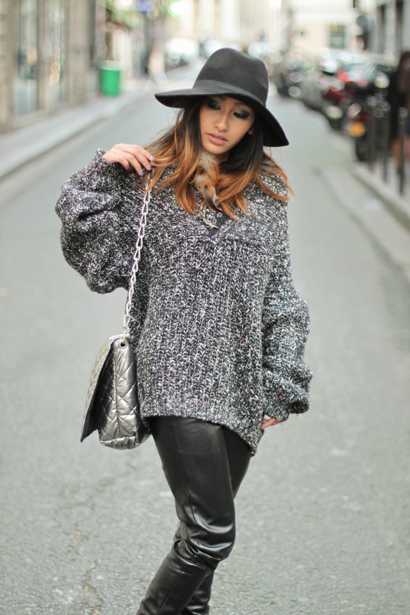 Aujourd’hui, je présente un look assez simple avec un côté vintage. Je porte un pull oversize trouvé au vide dressing géant pour seulement 3 euros ( et oui je suis trop fière de ma trouvaille ) ainsi que la capeline qui me taille parfaitement, parce qu’à chaque fois je trouve des chapeaux trop grand pour moi. Ce matin j’écoutais I love « Rock’n Roll » de Joan Jett, j’ai eu envie d’être rock en portant ce pantalon simili cuir (old collection) et voilà le résultat!